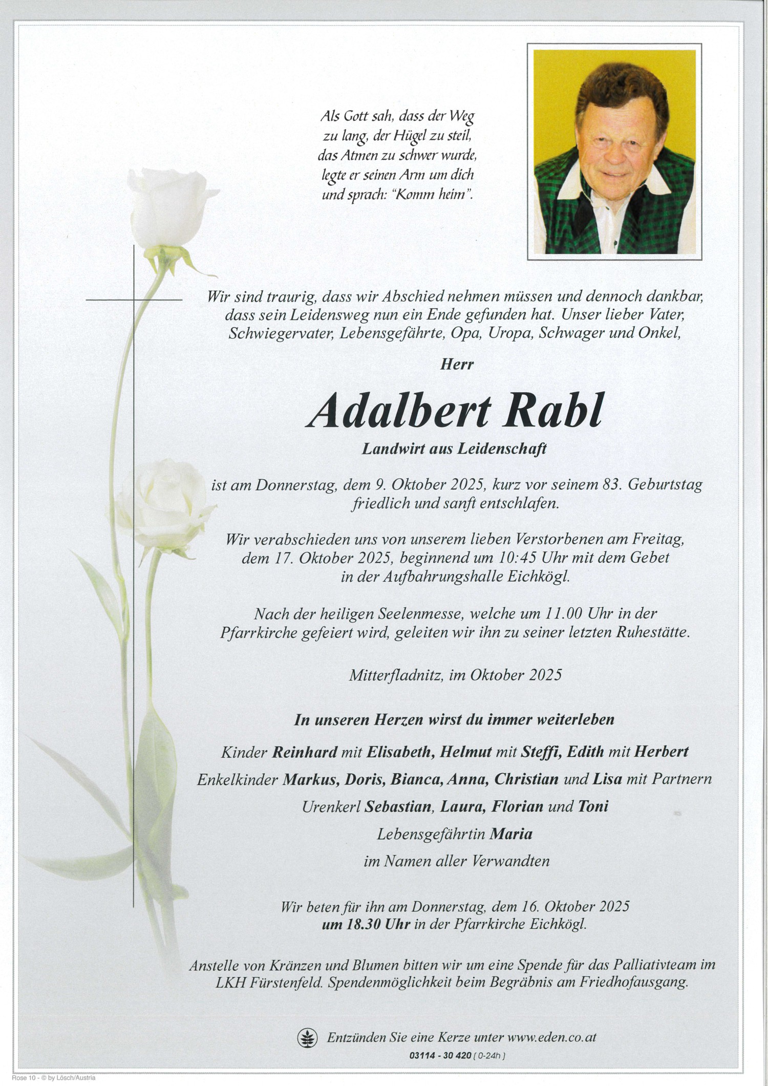 Adalbert RablEichkögl-Mitterfladnitz13.11.1942 - 09.10.2025 Adalbert Rabl 13.11.1942 - 09.10.2025Als Gott sah, dass der Weg zu lang, der Hügel zu steil, das Atmen zu schwer wurde, legte er seinen Arm um dich und sprach: “Komm heim”. Gedenkkerzen Kondolenzbuch Parte Kerze anzündenBetreffNachrichtNoch max. 140 ZeichenRuhe in Frieden! ReinhardRuhe in Frieden! Familie SattlerRuhe in Frieden! Markus, Silke & Elisa GenserRuhe in Frieden 🕯 wir werden dein Andenken stets in Ehren halten. Bianca mit Stefan, Laura und Florian"Die Erinnerung ist ein Fenster, durch das wir dich immer sehen können.“ Herzliches Beileid der Trauerfamilie, Elisabeth Michael CharlotteAufrichtige Anteilnahme Fam. Hannes und Michaela Tieber mit ErnestineEin Licht für deine letzte Reise. 🕯️ Deine Schwägerin Gisi, Regina mit GerhardRuhe in Frieden dein Freund Hans KöckRuhe in Frieden! In lieber Erinnerung Familie Manfred HausleitnerLetzte liebe Grüße und der Trauerfamilie mein herzliches Beileid Alois SammerRuhe sanft, in Gottes Hand! Aufrichtiges Beileid der Trauer Familie Georg und Gerlinde SteyerRuhe in Frieden,mögen Engel dich begleiten auf deiner letzten Reise von Faml.Hermann RathDas Leiden hat ein Ende genommen, nun ruhe in Frieden. Letzte Grüße Schwiegersohn HerbertAufrichtige Anteilnahme! Christine HirschmannMein aufrichtiges Beileid! HR Mag.iur. Herbert FuikMein aufrichtiges Beileid! HR Mag.iur. Herbert FuikAufrichtige Anteilnahme Familie MargreitnerEngel mögen dich auf deiner letzte Reise begleiten Deine Nachbarin Sylvia mit Klaus servus BertlEin letztes Licht für deine Reise. Wir werden dich nie vergessen. Ruhe in Frieden. Helmut mit SteffiHerzliches Beileid der ganzen Familie 🕯️ Familie TheisslAufrichtige Anteilnahme den Angehörigen. Lipp Herbert und TraudlUnser aufrichtiges Beileid 🕯 Familie BartlmeZwei fleißige Hände können sich nun für immer ausruhen! Gute Reise und ruhe in Frieden! Deine EdithRuhe in Frieden🕯Herbert und Doris Weigl mit FamilieRuhe in Frieden Bertl. Gerald&ChristaUnsere aufrichtige Anteilnahme - ruhe in Frieden. "Wenn die Sonne des Lebens untergeht, leuchten die Sterne der Erinnerung," Helga, ManfredRuhe in Frieden, lieber Bertl Peter & SilviaRuhe in Frieden Fam. Niesswohl und GudmannAufrichtige Anteilnahme Christoph und MichaelaIn lieber Erinnerung! Rosi und Hans SchöglerRuhe in Frieden!Fam.Reinhart und Schwager Sepp🕯️Ruhe in FriedenEin letzter Gruß lieber Bertl und einmol seh'n ma uns wieda. Ruhe in Friede 🪔 Aufrichtiges Beileid - KFZ - Ritter Heli mit Fam. 🥀🙏Ruhe sanft lieber Bertl 🖤😪KarinRuhe in Frieden! Bertl Fam.Roland HorvathAufrichtige Anteilnahme. Karl und Christiana ObermayrRuhe in Frieden! In lieber Erinnerung Fam. Sepp Gerger.In lieben Gedenken Werner u.Gerlinde KreinzIn lieber Erinnerung! Schneider Friederike🙏Ruhe in Frieden Bertl ! In lieber Erinnerung Traude 🕯Ruhe in Frieden Opa 🕯 ich werde dich vermissen, AnnaRuhe in Frieden - deine Nachbarin Waltraud FartekRuhe in Frieden Familie Christine Rathkolb.Ruhe in Frieden Familie Christine Rathkolb.KondolenzbuchBetreffNameNachrichtWir bitten um Ihr Verständnis, dass die Eintragung im Kondolenzbuch erst nach Prüfung unsererseits freigegeben werden können. Wir wollen damit die Veröffentlichungen von nicht pietätvollen Texten unterbinden.Es wurden noch keine Nachrichten im Kondolenzbuch eingetragen.Blumen als stiller Gruß des AbschiedsIn Zeiten des Abschieds möchten wir Ihnen die Last der Organisation abnehmen. Wählen Sie aus einer liebevoll gestalteten Auswahl an Blumenarrangements, die wir termingerecht zur Trauerfeier oder Aufbahrung liefern. Mit Sorgfalt und Einfühlungsvermögen kümmern wir uns um jedes Detail, damit Sie sich in dieser schwierigen Zeit um nichts kümmern müssen.