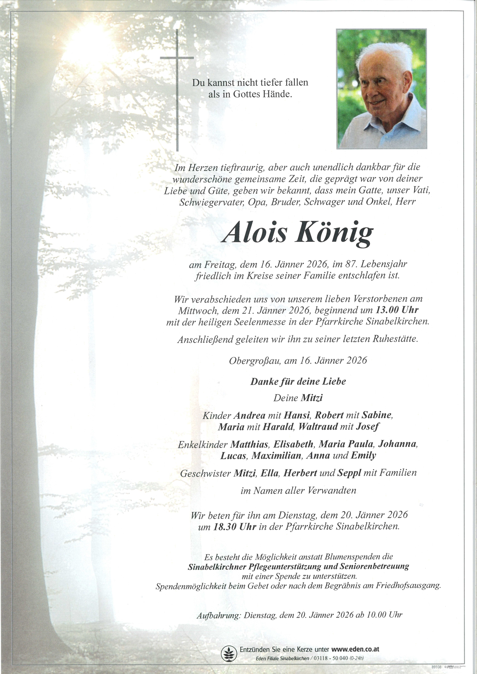 Aufbahrung am Dienstag, dem 20. Jänner 2026 ab 10.00 Uhr
