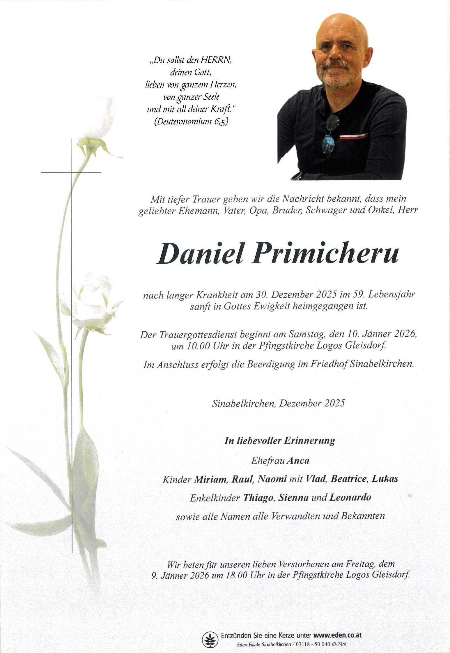 Daniel PrimicheruSinabelkirchen26.08.1966 - 30.12.2025 Daniel Primicheru 26.08.1966 - 30.12.2025,,Du sollst den HERRN, deinen Gott, lieben von ganzem Herzen, von ganzer Seele und mit all deiner Kraft.“ (Deuteronomium 6,5) Gedenkkerzen Kondolenzbuch Parte Kerze anzündenBetreffNachrichtNoch max. 140 ZeichenVermisse dich!!! Ruhe in FriedenRuhe in Frieden😭😭😭😭Ruhe in Frieden und aufrichtiges Beileid der Trauerfamilie. Familie GläßlUnser herzliches Beileid 🕯️ Gabriele Reithofer mit FamilieDaniel, ein Menschensengel! Vater hatte Dich sehr gerne und sprach ständig von Deiner Hilfsbereitschaft! Danke sagt Eduard König mit Fam.!In Liebe und Dankbarkeit, Familie Groza! Du fehlst uns sehr!Tief betroffen, in lieber Erinnerung und eine gute Reise wünscht von Herzen Andrea Wagner. Der Familie viel Kraft in dieser schweren ZeitIn Stille Gerti KochaufHerzlichstes Beileid der Trauerfamilie! G.SchwarzenbergerDanke für deine langjährige Freundschaft! Ruhe in Frieden! Dein Freund Georg und FamilieLieber Daniel,Ruhe in Frieden, Daniel. Mein aufrichtiges Beileid der Trauerfamilie. Birgit KoberLieber Daniel, Ruhe in Frieden. Es war schön, dich gekannt zu haben. Viel Kraft für die Familie. Karl & Heidi MeisterLieber Daniel , Ruhe in Frieden ! Claudia und Karl-HeinzHerzliche AnteilnahmeUnser tief empfundenes Mitgefühl der Trauerfamilie! Fam. PratscherRuhe in Frieden. Ein Licht für deine Reise. In lieber Erinnerung, Helga & Kurt MeisterViel Kraft für alle und gute Reise!In lieber Erinnerung, das Team der Apotheke SinabelkirchenRuhe in Frieden, Daniel. Katharina&WolfgangÎmi pare rău, dragul meu cumnat, că ai plecat la ceruri atât de repede. Îmi va fi dor de tine și nu te voi uita niciodată. Vei rămâne mereuFür immer im Herzen. Wir vermissen dich sehr.Ruhe in Frieden, Papa Dein Sohn RaulDu wirst für immer in meinem Herzen bleiben. Du warst für mich mein liebster Onkel. Ganz viel kraft an die ganze Familie. KevinRuhe in Frieden🕊️ Gott schenke dir ewigen Frieden und deiner Familie Trost und Kraft die schweren Momente zu überwinden (Elissa)Lieber Daniel, ich hoffe, du bist gut im Himmel angekommen.. 🪽✨️ Greiner SonjaIn lieber Erinnerung im Glauben an die Auferstehung - Viel Kraft der Familie Paul Peter Höfler samt FamilieRuhe in Frieden💔Ruhe in Frieden! Dan u Ana RosuMein geliebter Ehemann, du wirst mir unendlich fehlen. Danke für jede gemeinsame Sekunde, für deine Liebe und dein Lachen. In liebe Anca ❤️Mein geliebter Ehemann, du wirst mir unendlich fehlen. Danke für jede gemeinsame Sekunde, für deine Liebe und dein Lachen. Ich liebe Anca ❤️In lieber Erinnerung und aufrichtiges Beileid die Knusperbackstube Wurm in Sinabelkirchen 🕯️Papa, du fehlst uns so sehr. Deine Nähe, dein Lachen und deine Fürsorge werden wir niemals vergessen. MiriIn aufrichtiger Anteilnahme Sophie IthalerRuhe in Frieden.. Roswitha und Harald ErtlRuhe in Frieden.. Roswitha und Harald ErtlRuhe in Frieden, mein lieber Papa. Wir sehen uns im Himmel wieder. Deine Betty 💗2 Corinteni 5:1 [1] Știm, în adevăr, că, dacă se desface casa pământească a cortului nostru trupesc, avem o clădire în cer de la DumnezeuRuhe in Frieden Papa, dein Lukas🕊️Ruhe in Frieden in Gottes Reich 🙏 Fam KoberRuhe in Frieden KatrinRuhe in Gottes Hand! Deine Herzlichkeit bleibt unvergessen! In inniger Dankbarkeit, Monika mit Werner und Anja🙏RUHE IN FRIEDEN.Wir sehen uns oben🤍 Ruhe in Frieden 🤍Mein aufrichtiges Mitgefühl. Ruhe in Frieden. Heidi MaierRuhe in Frieden Daniel Danke für alles was du für unsere Familie gemacht hast Familie Gitti und Peter HoferKondolenzbuchBetreffNameNachrichtWir bitten um Ihr Verständnis, dass die Eintragung im Kondolenzbuch erst nach Prüfung unsererseits freigegeben werden können. Wir wollen damit die Veröffentlichungen von nicht pietätvollen Texten unterbinden.Va dorim sincere condoleanțe dragă familie îndurerată, Dumnezeu să vă mângâie și să vă întărească 🙌❤️Dani și Doina Handolescu, 09.01.2026Sincere condoleante familiei indurerate,iar tie sa iti fie tarina usoara si odihna vesnica om bun !Sanda si Petre Dohotar, 05.01.2026Draga Anca și familie, Sincere condoleanțe din partea noastră. Ne rugăm ca Domnul să vă mângâie inimile și să vă întărească în încercarea aceasta. Mare va fi ziua revederii 🙏🏼❤️!Nelly Langelandsvik, 05.01.2026Sincere condoleante din partea mea si a mamei mele (Irina) la toata familia! Herzliches Beileid und viel Kraft in dieser schweren Zeit!Oana Maria Dohotar, 04.01.2026,,Îmi pare rău, dragul meu cumnat, că ai plecat la ceruri atât de repede. Îmi va fi dor de tine și nu te voi uita niciodată. Vei rămâne mereu în inima mea.”Cazacu Laurențiu, 04.01.2026Das Leben ist eine Reise, die bei Gott ihr Ziel findet. Der Herr tröste die Familie und schenke ihr seinen Frieden.Liviu & Diana Mitrea, 04.01.2026Unsere aufrichtiges Beileid! Für die Familie viel Kraft!🙏🏻Dan und Ana Rosu, 03.01.2026Du warst der beste Papa der Welt. Wir vermissen dich💔Beatrice Primicheru, 03.01.2026Mein Beileid und viel Kraft der Familie!🙏Ion kober, 03.01.2026Dein Lächeln bleibt in unseren Herzen. KatrinKober Katrin, 03.01.2026Wir werden dich, Papa, immer vermissen und nie vergessen. ❤️Miriam Primicheru, 03.01.2026Blumen als stiller Gruß des AbschiedsIn Zeiten des Abschieds möchten wir Ihnen die Last der Organisation abnehmen. Wählen Sie aus einer liebevoll gestalteten Auswahl an Blumenarrangements, die wir termingerecht zur Trauerfeier oder Aufbahrung liefern. Mit Sorgfalt und Einfühlungsvermögen kümmern wir uns um jedes Detail, damit Sie sich in dieser schwierigen Zeit um nichts kümmern müssen.