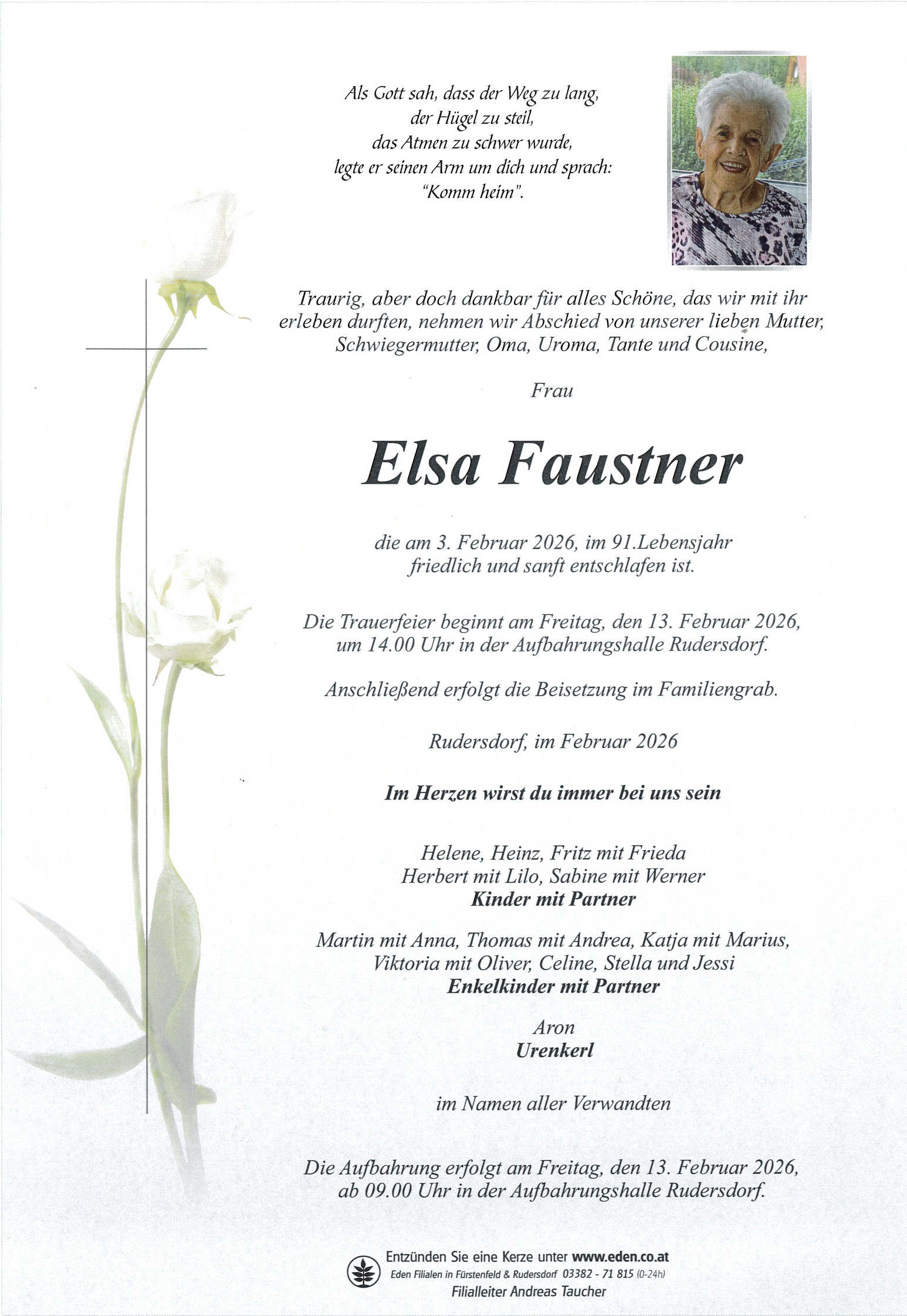 Elsa FaustnerRudersdorf21.10.1935 - 03.02.2026 Elsa Faustner 21.10.1935 - 03.02.2026Als Gott sah, dass der Weg zu lang, der Hügel zu steil, das Atmen zu schwer wurde, legte er seinen Arm um dich und sprach: “Komm heim”. Gedenkkerzen Kondolenzbuch Parte Kerze anzündenBetreffNachrichtNoch max. 140 ZeichenUnser aufrichtiges Beileid Kurt Zach und GreteHerzliches Beileid unsere Liebe Oma Elsa Faustner ❤️🌹Flori ,Andreea und IoanHerzlichstes Beileid! Inge HermannGute Reise Oma 🙏🏻 Tom & AndreaUnser aufrichtiges Beileid von Günter, Gabi und Kai StroblHerzliches Beileid Familie FaustnerHerzliches Beileid Familie FaustnerIn Liebe und Dankbarkeit deine Tochter HeleneGute Reise Oma💐 Vicky & OliverIn ewiger Liebe und Dankbarkeit dein Sohn Heinz.In ewiger Liebe und Dankbarkeit.Aufrichtige Anteilnahme Monika u. Walter PetzUnser aufrechtes BeileidIn lieber Erinnerung. Aufrichtiges Beileid der Trauerfamilie AnnemarieIn lieber Erinnerung. Gabi RathgebRuhe sanft in Gottes HandGute reise oma🖤-liches Beileid Eva und FamilieUnser aufrichtiges Beileid, Tanja und WernerUnser Aufrichtiges Beileid. Helmuth und DagmarRuhe in Frieden herzliches Beileid Helga und Bernhard LaglerHerzliches Beileid Ruhe in Frieden Helga U Bernhard LaglerUnser Aufrichtiges Beileid. Reinhard und Dunja WeberMenschen, die wir lieben, gehen uns nicht verloren, denn sie hinterlassen Spuren in unseren Herzen! Aufrichtige Anteilnahme Anita &WolfgangIn Liebe und Dankbarkeit Herbert und Lilo 🖤🩶🤍❤️In lieber Erinnerung. Mein herzliches Beileid den trauernden Angehörigen. Maria BauerNicht verloren- Nur vorangegangen Du bist uns allen einen Schritt voraus. In stillen Gedanken Renate und MarkusIn lieber Erinnerung! Mein herzliches Beileid der Trauerfamilie,Du wirst für immer in unseren Herzen bleiben! Danke für alles! 🖤 Katja, Marius & AronDu bist immer in unserem Herzen verankert und wirst nie vergessen werden. Wir lieben DICH Sabine, Werner, Celine, Stella u. Jessie❤️❤️❤️❤️❤️Danke für alles! Wir werdendich in unserem Herzen behalten. Fritz und Frieda 🥀Unser Aufrichtiges Beileid! Hannes und Klaudia BraunKondolenzbuchBetreffNameNachrichtWir bitten um Ihr Verständnis, dass die Eintragung im Kondolenzbuch erst nach Prüfung unsererseits freigegeben werden können. Wir wollen damit die Veröffentlichungen von nicht pietätvollen Texten unterbinden.Es wurden noch keine Nachrichten im Kondolenzbuch eingetragen.Blumen als stiller Gruß des AbschiedsIn Zeiten des Abschieds möchten wir Ihnen die Last der Organisation abnehmen. Wählen Sie aus einer liebevoll gestalteten Auswahl an Blumenarrangements, die wir termingerecht zur Trauerfeier oder Aufbahrung liefern. Mit Sorgfalt und Einfühlungsvermögen kümmern wir uns um jedes Detail, damit Sie sich in dieser schwierigen Zeit um nichts kümmern müssen.