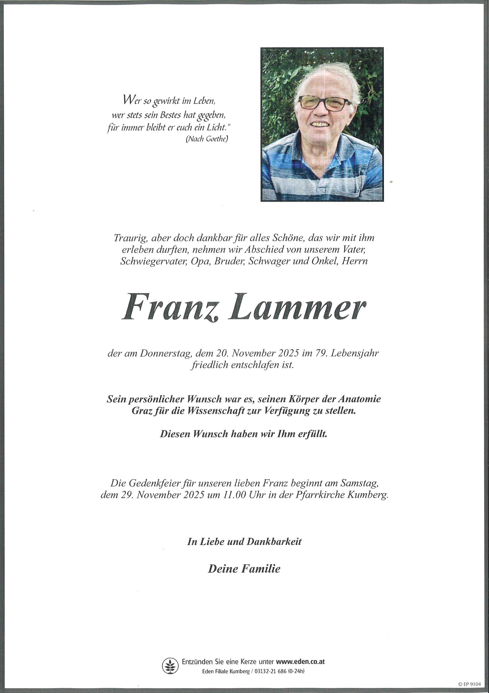 Die Gedenkfeier findet am Samstag, dem 29. November 2025 um 11.00 Uhr