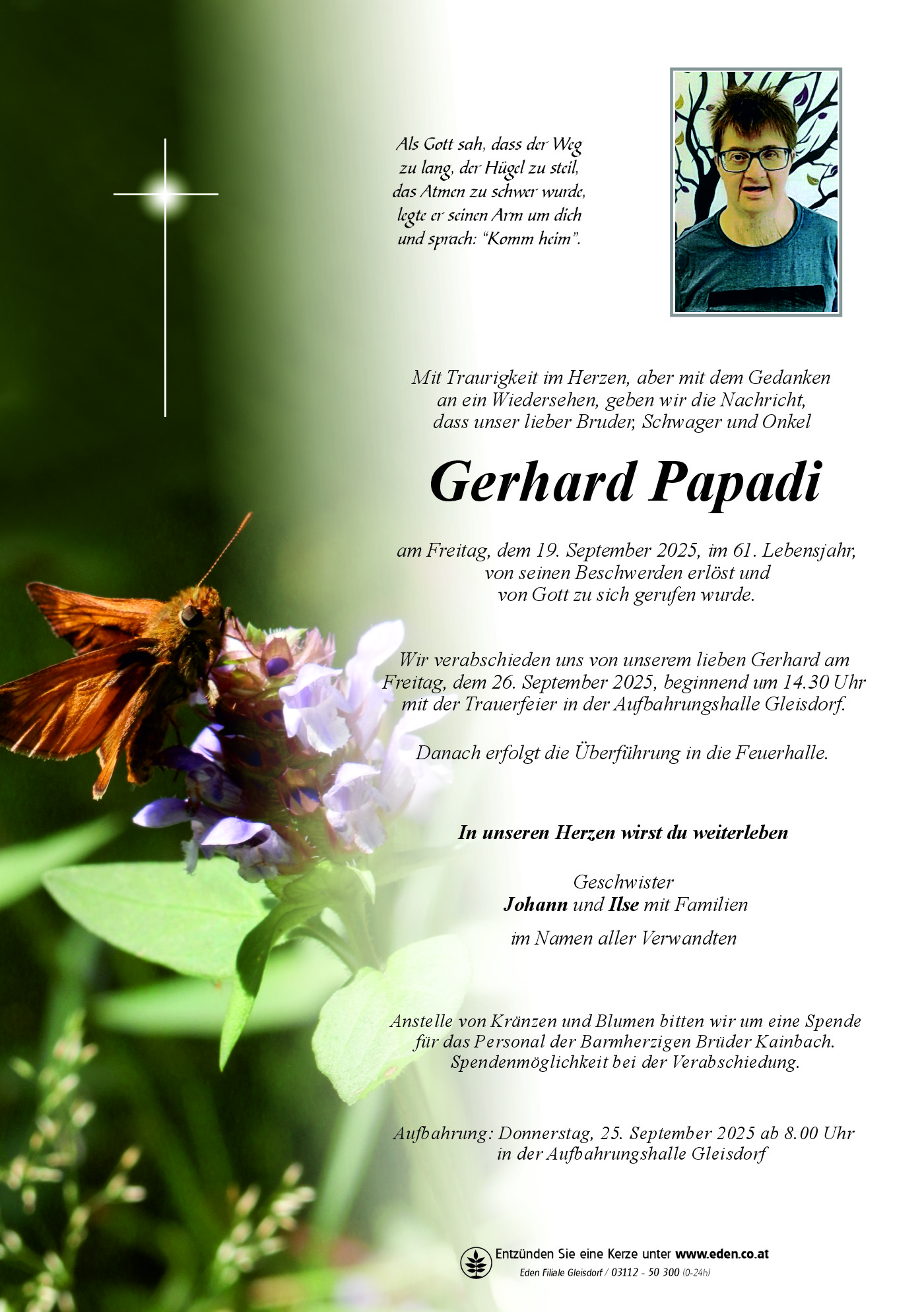 Gerhard PapadiGleisdorf-Kainbach19.04.1965 - 19.09.2025 Gerhard Papadi 19.04.1965 - 19.09.2025Als Gott sah, dass der Weg zu lang, der Hügel zu steil, das Atmen zu schwer wurde, legte er seinen Arm um dich und sprach: “Komm heim”. Gedenkkerzen Kondolenzbuch Parte Kerze anzündenBetreffNachrichtNoch max. 140 ZeichenRuhe in Frieden,Fam.HammerEin Lichtl für die letzte Reise über den Regenbogen 🌈 🌈 🌈 🌈Ein Licht für dich!In stiller Anteilnahme 🙏🕯Ruhe in FriedenRuhe in Frieden. Herzliches Beileid, dein ehemaliger Besuchsdienst KerstinRuhe in FriedenAufrichtige Anteilnahme 🌹🌹🌹Wir denken an dich... Ruhe in Frieden...Ruhe sanft in Gottes Hand. In lieber Erinnerung Fam. Erika und Willi Fritz -StroblIm Gedanken u im Herzen bist du immer bei uns!Wir wünschen das du gut angekommen bist u glücklich in den Händen Gottes❤️🌺Deine FamilieIm Gedanken u im Herzen bist du immer bei uns!Wir wünschen das du gut angekommen bist u glücklich in den Händen Gottes❤️🌺Deine FamilieGott hat einen Engel gebraucht !🕯️🕯️🕯️Ruhe in Frieden. Komm gut nach Hause lieber Gerhard. 🍁🙏🍁Unser Herr Jesus Christus möge dich liebevoll in seine Arme nehmen. 🙏Ein Licht für deine letzte Reise und einen guten Platz im Himmel. Leuchte liebevoll weiter.RUHE IN FRIEDEN.Ruhe sanft in Gottes Hand!KondolenzbuchBetreffNameNachrichtWir bitten um Ihr Verständnis, dass die Eintragung im Kondolenzbuch erst nach Prüfung unsererseits freigegeben werden können. Wir wollen damit die Veröffentlichungen von nicht pietätvollen Texten unterbinden.Liebe Trauernde - für Euch, Trost aus der Bibel! Wenn ein geliebter Mensch aus der Familie stirbt, lässt sich der Schmerz oft kaum ertragen. Wir fühlen uns hilflos und wir können nichts tun, um Ihn zum Leben zu bringen. In so einer Situation gibt uns die Bibel echten Trost. Hiob, ein treuer Diener Gottes, glaubte fest an die Auferstehung. Er fragte: „Wenn ein Mensch stirbt, kann er wieder leben?“ Dann sagte er zum Schöpfer: „Du wirst rufen und ich werde dir antworten. Nach dem, was deine Hände geschaffen haben, wirst du dich sehnen.“ Hiob wusste also, dass sich Gott sogar darauf freut, die Toten aufzuerwecken (Hiob 14:13-15). Was dürfen der Gerhard und wir erwarten? In der Vergangenheit lebten die Auferstandenen wieder auf der Erde bei ihrer Familie und ihren Freunden. So wird es auch in Zukunft sein, nur noch viel besser: Den Auferstandenen steht in Aussicht, für immer auf der Erde zu leben (Psalm 37:29). Sie werden nie mehr sterben müssen (Offenbarung 21:3-5). Und das Leben wird dann ganz anders sein, als wir es heute kennen. Es wird keinen Krieg, keine Verbrechen keine Krankheiten und keine tragischen Ereignisse mehr geben (Sprüche 1:33; Jesaja 33:24). Das, und noch mehr an sehr wünschenswerten Veränderungen durch das Reich Gottes, verspricht unser Lebengeber in seinen Buch, die Bibel. Mögen Euch diese begeisternden Wahrheiten in eurer Trauer, Trost, und Hoffnung auf ein glückliches irdisches Wiedersehen geben. Das wünsche ich Euch!Hermann, 15.10.2025Blumen als stiller Gruß des AbschiedsIn Zeiten des Abschieds möchten wir Ihnen die Last der Organisation abnehmen. Wählen Sie aus einer liebevoll gestalteten Auswahl an Blumenarrangements, die wir termingerecht zur Trauerfeier oder Aufbahrung liefern. Mit Sorgfalt und Einfühlungsvermögen kümmern wir uns um jedes Detail, damit Sie sich in dieser schwierigen Zeit um nichts kümmern müssen.