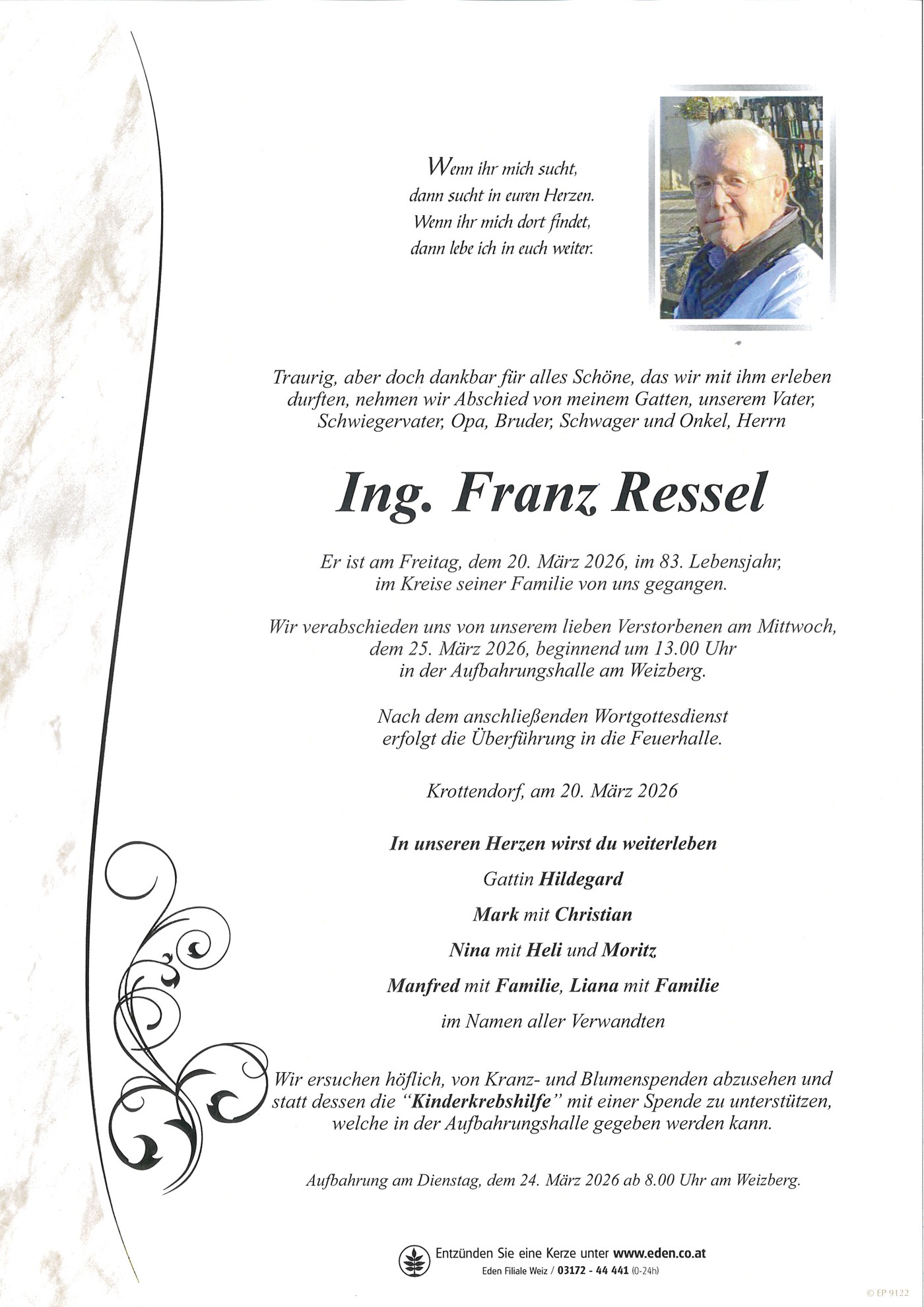 Aufbahrung am Dienstag, dem 24. März 2026 ab 8.00 Uhr, Aufbahrungshalle am Weizberg.