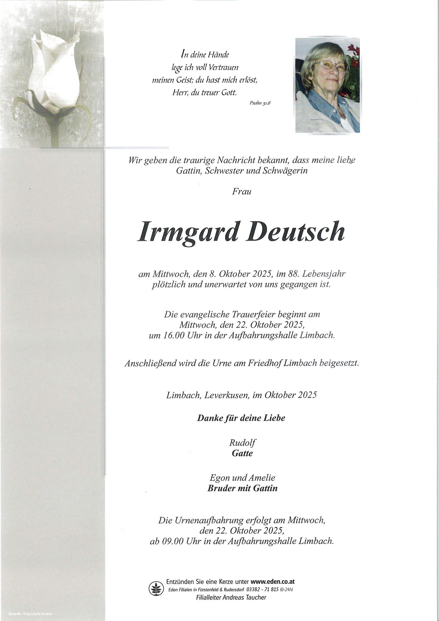 Irmgard DeutschLimbach20.10.1937 - 08.10.2025 Irmgard Deutsch 20.10.1937 - 08.10.2025In deine Hände lege ich voll Vertrauen meinen Geist; du hast mich erlöst, Herr, du treuer Gott. Gedenkkerzen Kondolenzbuch Parte Kerze anzündenBetreffNachrichtNoch max. 140 ZeichenIn liebevoller Erinnerung- Familie Gibiser- BraunIn lieber Erinnerung Familie Kropf OttiRuhe in Frieden 🕯️In lieber Erinnerung Dein Bruder Egon und AnnelieLiebe Irmgard, Ruhe in Frieden. Markus und VeraLiebe Irmgard, wir denken an Dich . Sabine & AndiLiebe Irmgard, Ruhe in Frieden. Laura und KarliEin lieber letzter Gruß Familie BraunMein aufrichtiges Beileid Lagler HelgaKondolenzbuchBetreffNameNachrichtWir bitten um Ihr Verständnis, dass die Eintragung im Kondolenzbuch erst nach Prüfung unsererseits freigegeben werden können. Wir wollen damit die Veröffentlichungen von nicht pietätvollen Texten unterbinden.Es wurden noch keine Nachrichten im Kondolenzbuch eingetragen.Blumen als stiller Gruß des AbschiedsIn Zeiten des Abschieds möchten wir Ihnen die Last der Organisation abnehmen. Wählen Sie aus einer liebevoll gestalteten Auswahl an Blumenarrangements, die wir termingerecht zur Trauerfeier oder Aufbahrung liefern. Mit Sorgfalt und Einfühlungsvermögen kümmern wir uns um jedes Detail, damit Sie sich in dieser schwierigen Zeit um nichts kümmern müssen.