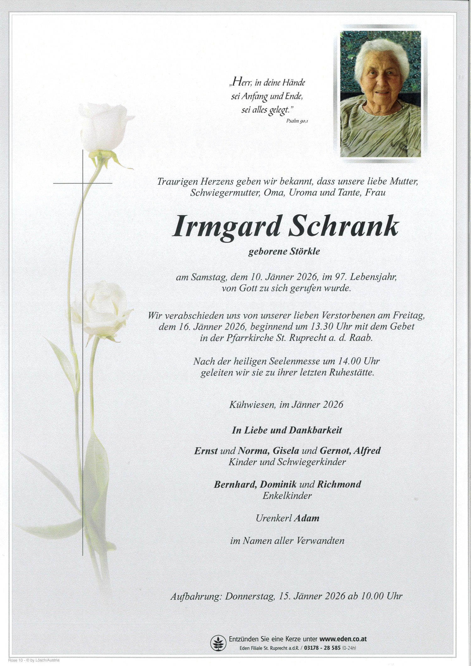 Liebe Irmgard Ruhe in Frieden! Du warst so ein guter und bescheidener Mensch! LG. Luis und Maria Pfeifer