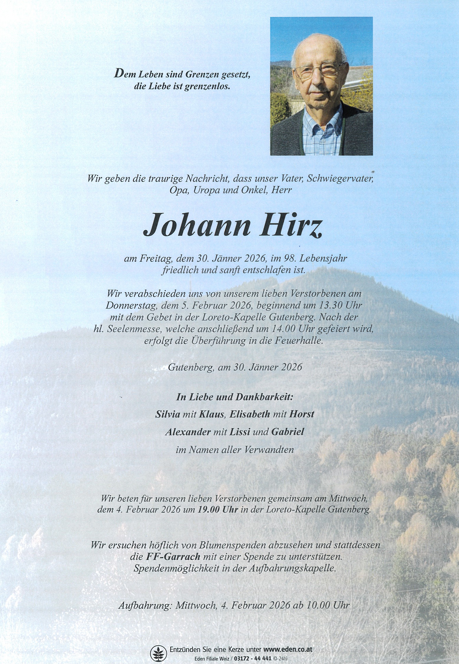 Unser aufrichtiges Beileid. Ruhe in Frieden, lieber Hans 🕯️. Fam. Luis Fasching