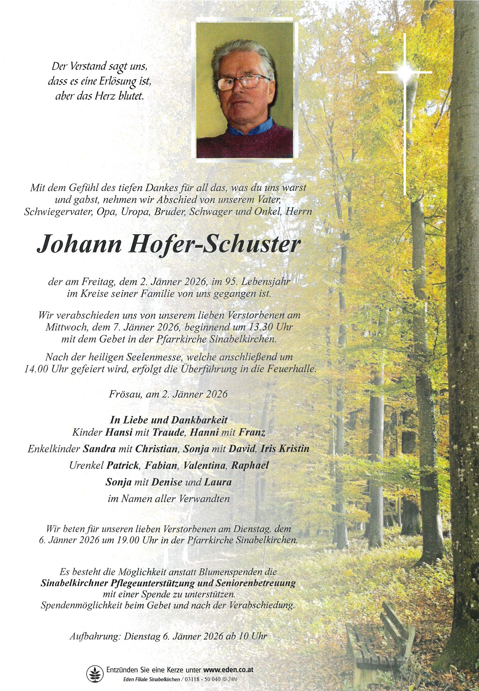 Johann Hofer-SchusterSinabelkirchen-Frösau31.05.1931 - 02.01.2026 Johann Hofer-Schuster 31.05.1931 - 02.01.2026Der Verstand sagt uns, dass es eine Erlösung ist, aber das Herz blutet. Gedenkkerzen Kondolenzbuch Parte Kerze anzündenBetreffNachrichtNoch max. 140 ZeichenIn lieber Erinnerung Kober Gerhard und MartinaIn stillem Gedenken. Familie SchaflerIn stillem Gedenken. Familie SchaflerHerzliches Beileid der Familie! Franz und Helga Maurer (Peierl)Herzliche Anteilnahme. Fam. Rosa PfeiferIn stillem Gedenken. Fam. EdelmannAufrichtiges Beileid. Fam. SperlIn lieber Erinnerung. Fam. Glatzer FranzIn lieber Erinnerung Monika und RudiIn lieber Erinnerung Fam. Ferdinand und Erna SchlofferIn stillem Gedenken 🕯️ Familie ManningerIn lieber Erinnerung Franz und Christl MaderHerzliches Beileid und viel Kraft für diese schwere Zeit 🕯 Familie Hubmann-PfeiferIn lieber Erinnerung und unsere aufrichtige Anteilnahme, Fam. Edi GroßschädlLeben ist wie Schnee.Du kannst ihn nicht bewahren.Trost ist, dass euer Opa da war, Stunden, Tage, Monate Jahre.In tiefem Mitgefühl AndreaH.In lieber Erinnerung! Luis und Karin mit MaxRuhe in Frieden Faml. Roswitha RomingerMögen Engel dich begleiten auf Weg der vor dir liegt und die Türe Öffnen die in Gottes Zukünftig führen aber sonja mauerhoferIn aufrichtiger Anteilnahme Toni und Roswitha KoberAufrichtiges Beileid. Erika und Franz BernthalerIn stillem Gedenken. Rudi und Monika HadoltIn aufrichtiger Anteilnahme, viel Kraft der Familie Benno und Resi KulmerIn aufrichtiger Anteilnahme Herta und Gerhard Rodler mit FamilieIn lieber Erinnerung und Ruhe in Frieden! Neffe Toni und GertiAufrichtige Anteilnahme Fam.Hemma RammingerRuhe in Frieden von Familie Kandlhofer LugendorfIm stillen Gedenken! Erika und Karl ZengererRuhe in Frieden von Familie Gschanes .In aufrichtiger Anteilnahme und viel Kraft der Trauerfamilie Fam. Inge und Robert PußwaldZum Abschied Payerl Gerhard mit SoniaIn aufrichtiger Anteilnahme Familie IthalerDu hast ein gutes Herz besessen, nun ruht es still und unvergessen. In Dankbarkeit, deine Nichte, Afra mit Gerhard und PascalIn dankbarer Erinnerung, Ruhe in Frieden. Dein Neffe Fritz, Marianne und Familie.Ruhe in Frieden lieber Onkel Johann. Sylvia und Werner Schönherr"Wenn die Kraft zu Ende geht, ist Erlösung Gnade." Ein Licht auf deinem letzten Weg. Danke Opa, Sandra m. Christian, Patrick u. FabianIn lieber Erinnerung, Ruhe in Frieden. Unser Aufrichtiges Beileid der Familie !! Herbert und Ursula Knaus🙏RUHE IN FRIEDEN.Aufrichtige Anteilnahme. Wiedner ErnstAufrichtige Anteilnahme. Wiedner ErnszIn lieber Erinnerung!Edeltraud und ManfredKondolenzbuchBetreffNameNachrichtWir bitten um Ihr Verständnis, dass die Eintragung im Kondolenzbuch erst nach Prüfung unsererseits freigegeben werden können. Wir wollen damit die Veröffentlichungen von nicht pietätvollen Texten unterbinden.mögen Engel Johann begleiten auf denn Weg vor dir liegt und die Türe öffnen die in Gottes Zukunft führt und dir nun mehr zeigen das dir Gott neues Leben gibt ohne leid schmerzen und so weiter das wünsche ich dir grüße sonja mauerhofersonja mauerhofer, 05.01.2026Unser Mitgefühl und Beileid für die Familie.Reinhold Rodler, 03.01.2026Blumen als stiller Gruß des AbschiedsIn Zeiten des Abschieds möchten wir Ihnen die Last der Organisation abnehmen. Wählen Sie aus einer liebevoll gestalteten Auswahl an Blumenarrangements, die wir termingerecht zur Trauerfeier oder Aufbahrung liefern. Mit Sorgfalt und Einfühlungsvermögen kümmern wir uns um jedes Detail, damit Sie sich in dieser schwierigen Zeit um nichts kümmern müssen.