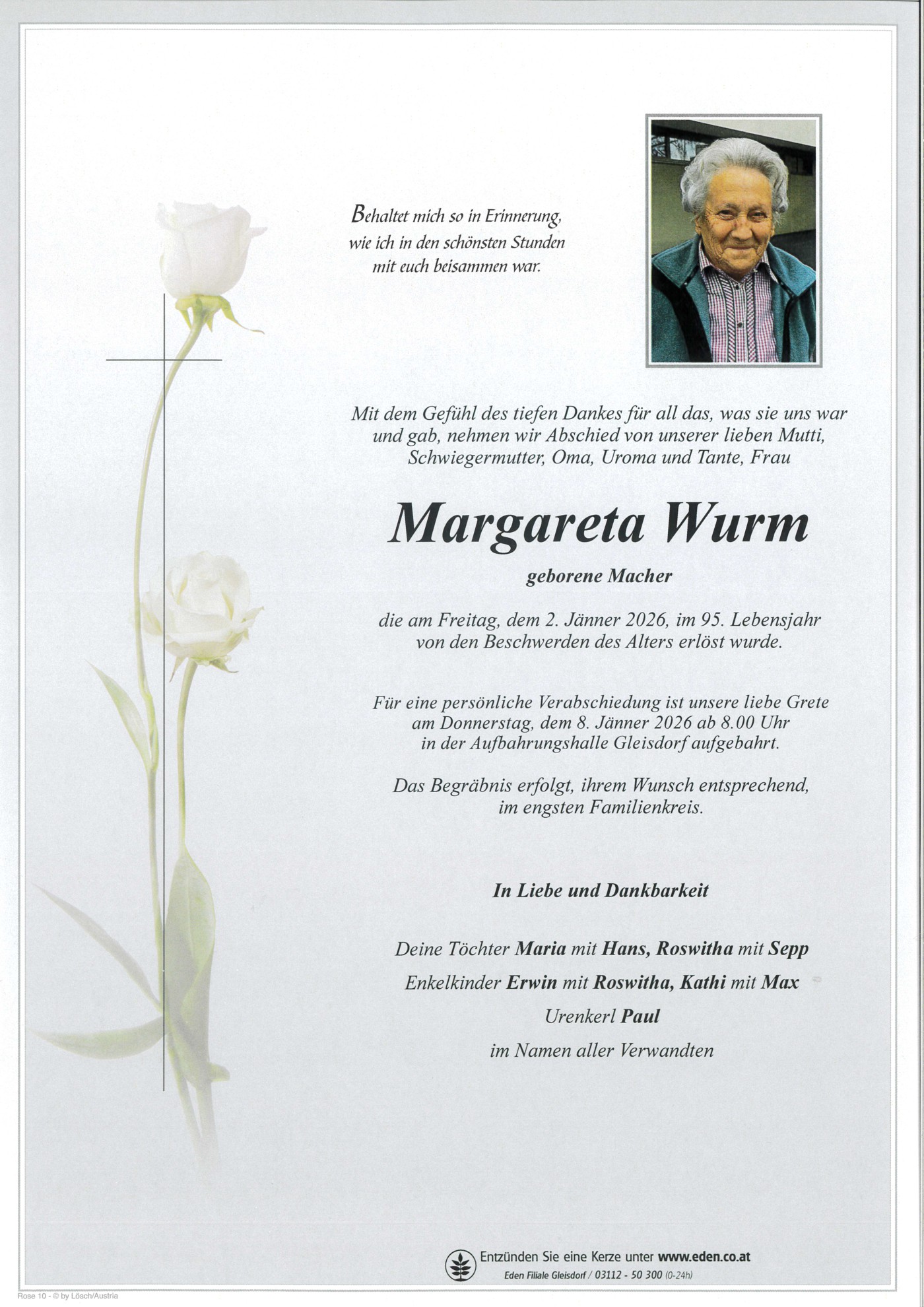 Margareta WurmGleisdorf-Arnwiesen04.06.1931 - 02.01.2026 Margareta Wurm 04.06.1931 - 02.01.2026Behaltet mich so in Erinnerung, wie ich in den schönsten Stunden mit euch beisammen war. Gedenkkerzen Kondolenzbuch Parte Kerze anzündenBetreffNachrichtNoch max. 140 ZeichenIn lieber Erinnerung! Mein herzliches Beileid an die Trauerfamilie! Eine ehemalige Nachbarin, Fam. ProßTief betroffen denken wir an die trauernden Angehörigen in dieser schweren Zeit🙏 Max R.Tief betroffen denken wir an die trauernden Angehörigen in dieser schweren Zeit🙏Schlaf' gut, wir denken an dich. Alles Liebe, Sabina und HeinzInnige Anteilnahme Familie PintRuhe in Frieden liebe Grete deine Arbeitskollegin 2.Med, Resi KagerLiebe Gretl! Ruhe in Frieden. Unser Aufrichtiges Beileid der Familie. Albin und BrigittaAufrichtige Anteilnahme Matthias, Irmi, Matthias und Julia WünscherRuhe in Frieden Der Trauerfamilie aufrichtiges Beileid Familie HagenauerRuhe in Frieden liebe Grete, habe mit dir sehr gerne Karten gespielt. Aufrichtige Anteilnahme Dorli (Freundin von Herta und Ingrid)Ruhe in Frieden liebe Grete🌠. Mein Beileid der Trauerfamilie Ingrid (Tochter von Herta)In liebervoller Erinnerung liebe Grete .Denke noch oft an unsere Feiern im Schillerhaus. Ruhe in Frieden. Ingrid (Tochter von Herta)In liebervoller Erinnerung liebe Grete .Denke noch oft an unsere Feiern im Schillerhaus. Ruhe in Frieden. Ingrid (Tochter von Herta)Aufrichtige Anteilnahme! Peter SchieferLetzten Gruß 1.OG BPH Gleisdorf 🕯️Im stillen Gedenken Christian vom BPH 2 StockRuhe in Frieden Alois und Gerlinde MoikDanke für die schöne Zeit die wir mit dir verbringen durften. In liebe Erinnerung. Fam. SchusterIn lieber Erinnerung Fam Maria HuberIn lieber Erinnerung Ruhe in Frieden🕯️Aufrichtige Anteilnahme Anton und Adelheid PaarIn stillem Gedenken und lieber Erinnerung Norbert und Monika ZechnerRuhe in FriedenKondolenzbuchBetreffNameNachrichtWir bitten um Ihr Verständnis, dass die Eintragung im Kondolenzbuch erst nach Prüfung unsererseits freigegeben werden können. Wir wollen damit die Veröffentlichungen von nicht pietätvollen Texten unterbinden.Es wurden noch keine Nachrichten im Kondolenzbuch eingetragen.Blumen als stiller Gruß des AbschiedsIn Zeiten des Abschieds möchten wir Ihnen die Last der Organisation abnehmen. Wählen Sie aus einer liebevoll gestalteten Auswahl an Blumenarrangements, die wir termingerecht zur Trauerfeier oder Aufbahrung liefern. Mit Sorgfalt und Einfühlungsvermögen kümmern wir uns um jedes Detail, damit Sie sich in dieser schwierigen Zeit um nichts kümmern müssen.