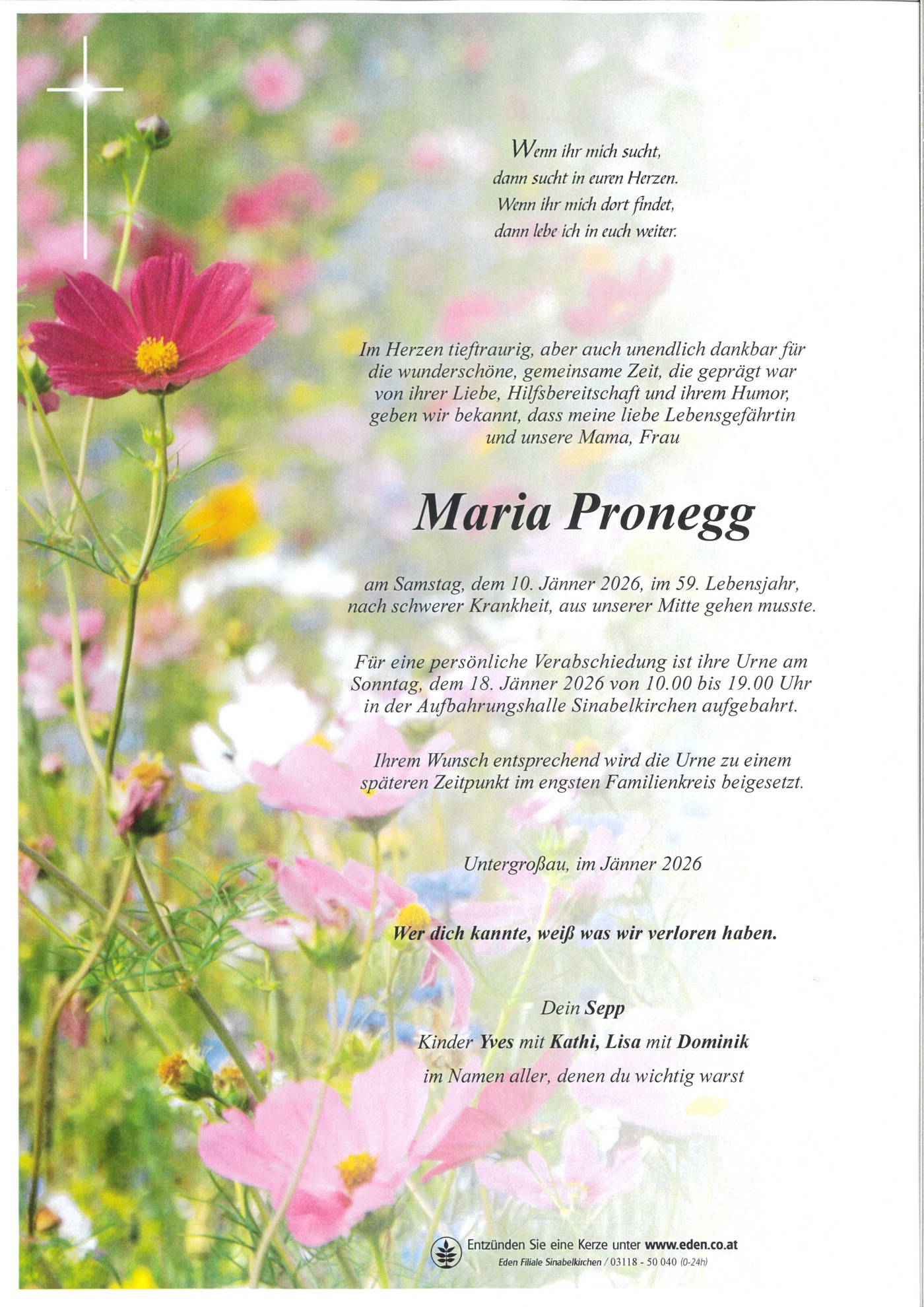 Maria ProneggSinabelkirchen-Untergroßau16.04.1967 - 10.01.2026 Maria Pronegg 16.04.1967 - 10.01.2026 Wenn ihr mich sucht, dann sucht in euren Herzen. Wenn ihr mich dort findet, dann lebe ich in euch weiter. Gedenkkerzen Kondolenzbuch Parte Kerze anzündenBetreffNachrichtNoch max. 140 ZeichenEin Engel soll dich begleitenEin Engel soll dich begleitenRuhe in Frieden liebe Maria. Viel Kraft deiner Familie. Andrea WagnerUnser tiefstes Mitgefühl der Trauer Familie, Herta und Ewald Purkarthofer 🕯Unser aufrichtiges Beileid. Möge die Erinnerung euch Kraft spenden und Trost geben. Gabi u. Günther ObendraufRuhe in Frieden. Kevin mit FamilieUnser aufrichtiges Beileid! Raimund und Elisabeth EdlingerRuhe in Frieden Maria. Ein Licht für dein heimgehen. Familie Hermann KochaufEngel sollen dich begleiten.Ruhe in Frieden!In stillen Gedenken. Ruhe in Frieden! Herzliches Beileid der Trauerfamilie. HeidiIn stillem Gedenken und lieber Erinnerung!Ruhe in Frieden. Mein herzliches Beileid der Familie 🕯️ Katharina SteinerAufrichtige Anteilnahme. VeronikaRuhe in FriedenLeb wohl sag ich dir leise, mach's gut auf deiner letzten Reise. Ruhe sanft in Gottes Hand. Den Angehörigen viel Kraft. M. GartlerAmoi seg ma uns wieder 🖤Ein letztes Danke schön für deine Mitarbeit. Ruhe in Frieden. Der letzte Gruß von der Gruppe " Der Berg ruft"Ein Licht auf deiner letzten Reise - Engel mögen deinen Weg begleiten - Ruhe in Frieden Ingrid und Herbert GroßIn liebevoller, Erinnerung Ruhe in Frieden viel Kraft den Angehörigen Walter TimischlLiebe Maria ruhe in Frieden, mögen Engel Dich begleitenEngel mögen dich begleiten.Ruhe in Frieden.Viel Kraft der ganzen Familie HildegardAlle Lichter werden dir leuchten! So viele positive Erinnerungen bleiben! Fam. Ochensberger Astrid, Peter u Patrizia & das Garten-Hotel-TeamUnd immer bleiben Spuren deines Lebens.Engel mögen dich begleiten. Viel Kraft den Angehörigen. Elfi und WilliUnd immer bleiben Spuren deines Lebens.Engel mögen dich begleiten. Viel Kraft den Angehörigen. Elfi und WilliUnd immer sind irgendwo Spuren deines Lebens. Engel mögen dich begleiten. Viel Kraft den Angehörigen. Elfi und WilliUnd immer sind irgendwo Spuren deines Lebens. Engel mögen dich begleiten. Viel Kraft den Angehörigen. Elfi und WilliMachs gut da wo du jetzt bist du wirst immer einen Platz in meinem Herzen habenAufrichtige Anteilnahme Kober LydiaAufrichtige Anteilnahme Kober LydiaIn lieber Erinnerung Familie Paul Peter Höfler - Viel Kraft der FamilieUnser aufrichtiges Beileid an die Hinterbliebenen FA. Gspandl 🕯️In stillem Gedenken. Ruhe in Frieden. Gerti und Hans BergerIn stillem Gedenken und lieber Erinnerung und mein aufrichtiges Beileid den Angehörigen. Roland H.Mögen Engel dich begleiten Eva HaidingerMan sieht die Sonne langsam untergehen und erschrickt doch, wenn es plötzlich dunkel ist. Ruhe in Frieden! Fam. Chris und Dani LeinerIn liebevoller, Erinnerung Ruhe in Frieden viel Kraft den Angehörigen Grete mit FamilieIn lieber Erinnerung Ruhe in FriedenIn lieber Erinnerung Ruhe in Frieden Resi KulmerMein Beileid Familie HollIn guter, schöner Erinnerung denke ich an dich. Liebe Maria, ruhe in Frieden! Aufrichtiges Beileid der Trauerfamilie. Maria, Trautmannsd.Ein Licht für deine letzte Reise! Viel Kraft allen Angehörigen. In lieber Erinnerung Gerti HartliebDanke für die gemeinsame Zeit in den fast 40 Jahren, die ich dich kennen durfte. Nur das Beste für dich und eine GUTE REISE ... DieterHab eine schöne (neue) Reise, frei von allem, was bis jetzt so schwer war.. 🪽✨️ Greiner SonjaRuhe in Frieden Berta🕯️❤️Ein Licht für deine letzte Reise, in lieber Erinnerung. Pfeffer GerlindeIn lieber Erinnerung 🌸 🙏🕯️Mein herzliches Beileid den Angehörigen 🙏 Erna EinsingerRuhe in Frieden!🕯 Aufrichtiges Beileid der Trauerfamilie!🙏 Roswitha, Franz und René HerbstIn lieber Erinnerung zünde ich diese Kerze für dich an, Deinen liebsten viel Kraf in dieser unendlich schweren Zeit. MarionLiebe Maria ruhe in Frieden, mögen Engel Dich begleiten. 🕯🌈Viel Kraft der Familie.🖤Ein Licht für Deine letzte Reise, in lieber Erinnerung Angelika und Sepp KlucsaricsRuhe sanft in Gottes Hand!Wir sind tief betroffen und trauern still mit euch🕯️. Unser aufrichtiges Beileid Petra, Günter & Michael🙏🕯️In lieber Erinnerung, Ruhe in Frieden, viel Kraft der Familie ResiLiebe Mitzal! Werden dich sehr vermissen,danke für alles was du für mich getan hast!Ruhe in Frieden ! Jasmin samt FamilieIn stillem Gedenken und lieber Erinnerung und aufrichtiges Beileid den Angehörigen Monika und Norbert ZechnerEin Licht für deiner letzten Reise Waltraud und Gerhard Rosenberger 🕯🕯Mein aufrichtiges Mitgefühl. Ruhe in Frieden. In lieber Erinnerung. Heidi MaierMein AUFRICHTIGES Beileid der FAMILIE Pichler AndreasRuhe in Frieden Maria In stillen Gedanken Familie FuchsRuhe in Frieden. Wie vermissen dich sehr Berta❤️Ruhe in Frieden Maria ln stillen Gedanken Familie Fuchs .Ein Licht für deine letzte Reise liebe Maria! Ruhe in Frieden! Unser aufrichtiges Beileid der Trauerfamilie . Familie Kober und RumplerEin Licht für deine letzte Reise🕯. Ruhe in Frieden ! Viel Kraft den Angehörigen. Leeb Linde 🕯🙏In stillem Gedenken Ingrid und Fritz GrabnerMein aufrichtiges Beileid! Karl DenggIn stiller Anteilnahme, Annemarie und AndreasRuhe in Frieden!Ein Licht fur deine letzte Reise liebe Maria! Den Angehörigen unser aufrichtiges Beileid! Hildegard und Walter SchlofferRuhe in Frieden Maria. In liebevoller Erinnerung an unsere Schulzeit, Gerhard StuzinIn lieber Erinnerung, das Team der Apotheke SinabelkirchenEin Licht auf deine Reise. 🕯🌈 Monika HaunIn lieber Erinnerung an unsere gemeinsamen Arbeitstage Chefin 🕯🙏.Ein Licht auf Deine letzte Reise Liebe Maria !! Dein Freundlichkeit und Herzlichkeit wird immer Bleiben. Mein Beileid der Familie UrsulaIn liebevoller Erinnerung ! Herbert,Anni und DietmarEin Licht für deine letzte Reise Maria. Viel Kraft