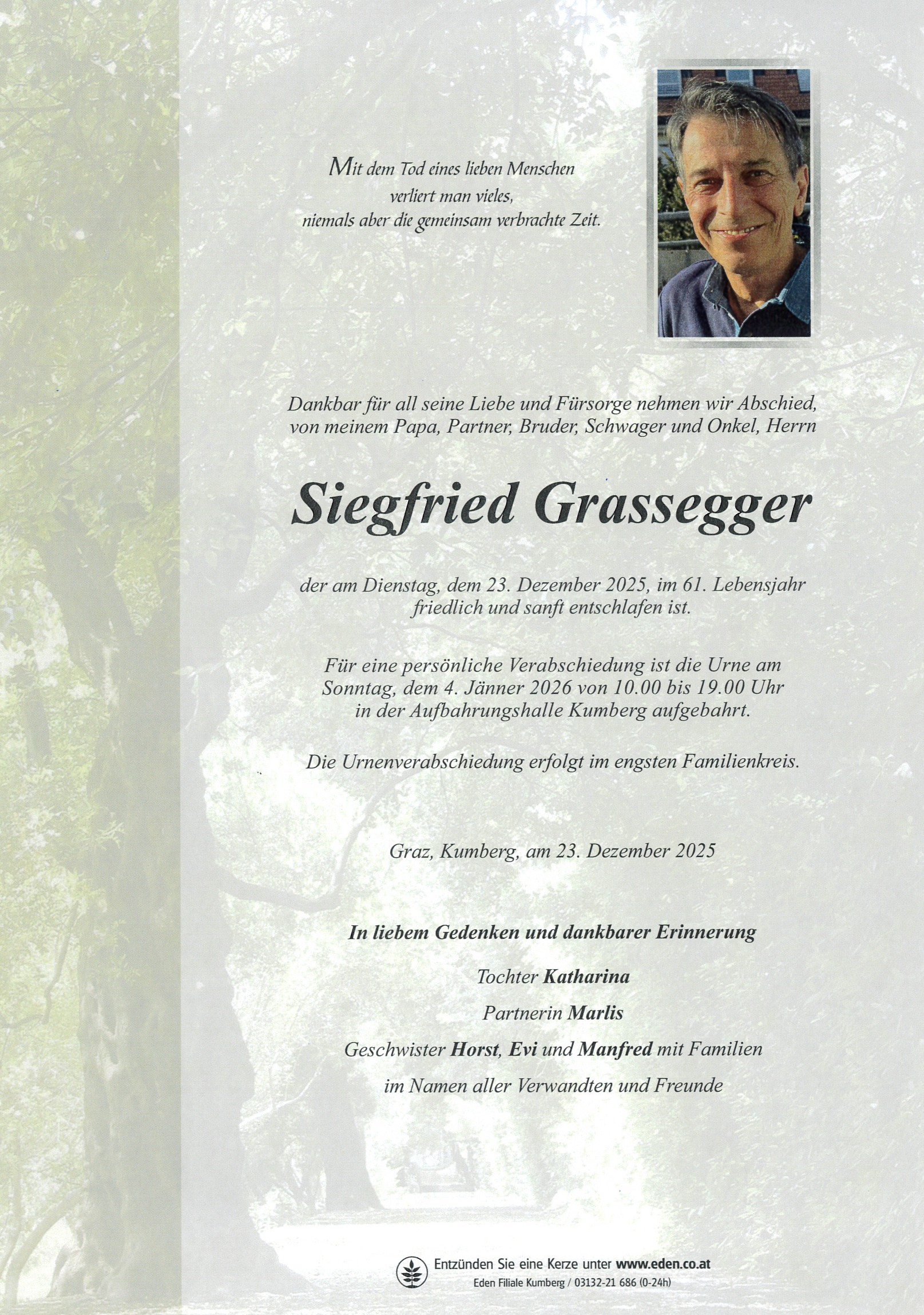 Urnenaufbahrung am Sonntag, dem 4. Jänner 2026 ab 10.00 Uhr