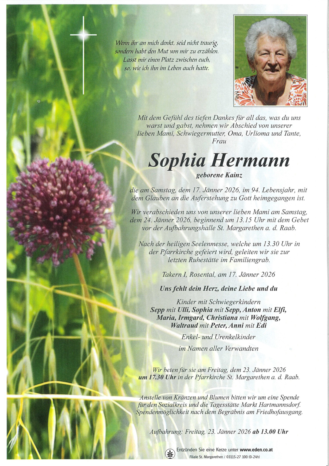Der Herrgott schenke der Verstorbenen Sophia die Freuden des Himmels. Danke für die wunderbar erlebte gemeinsame Zeit! Fam. Anton Paierl