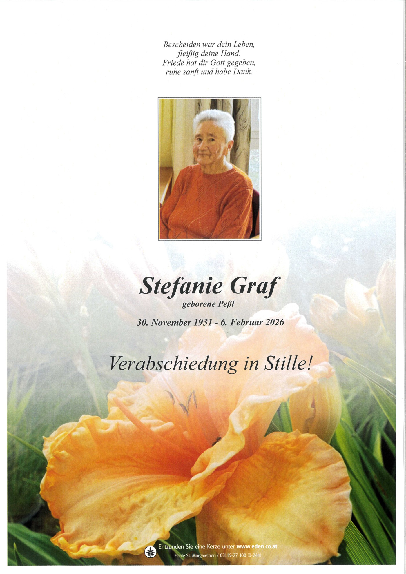 Bescheiden war dein Leben, fleißig deine Hand. Friede hat dir Gott gegeben, ruhe sanft und habe Dank.
